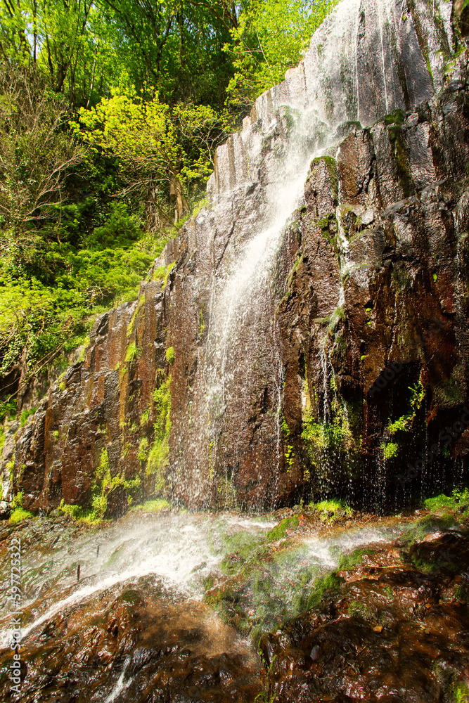 Wild and untamed waterfall in a remote wilderness area, water stream falls from above from a rock onto stones