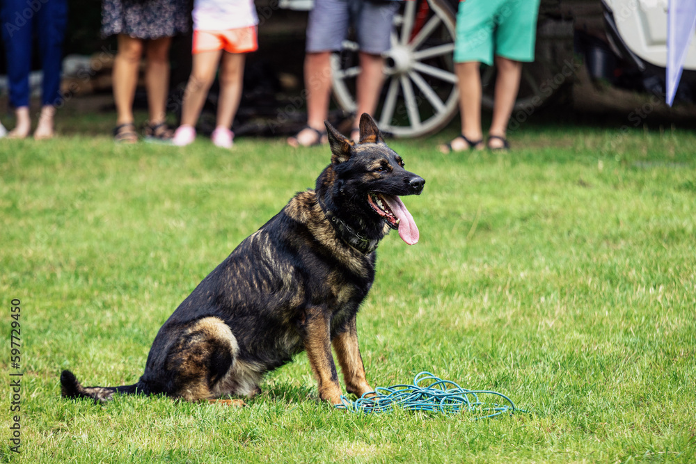 German shepherd sits on the grass with his tongue hanging out.Dog training