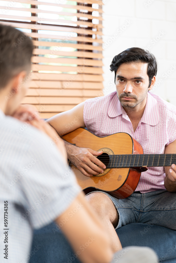 gay couple with guitar sitting on sofa. playing the guitar and singing a romantic song to his boyfriend