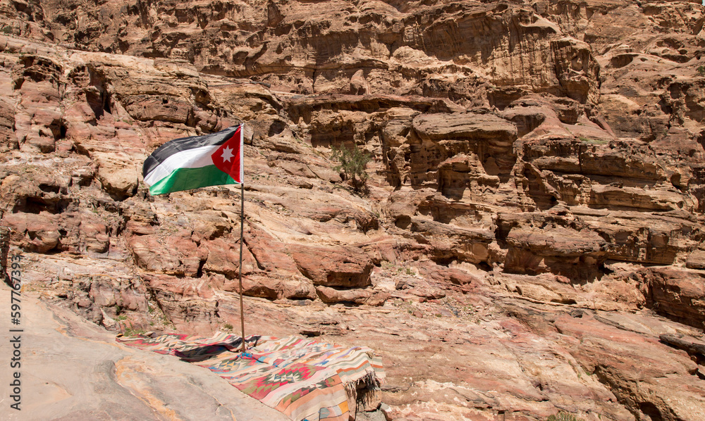 the flag of Jordan over the Ad-Deir trail, Petra, Jordan