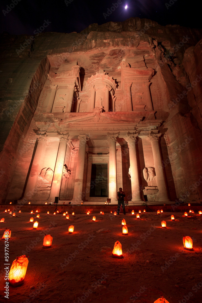 Al-Khazneh, the Treasury lit by candles at night in Petra, Jordan,