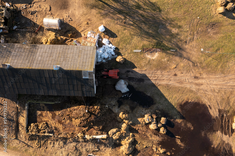 Drone photography of tractor taking hay bales to the shed with farm animals