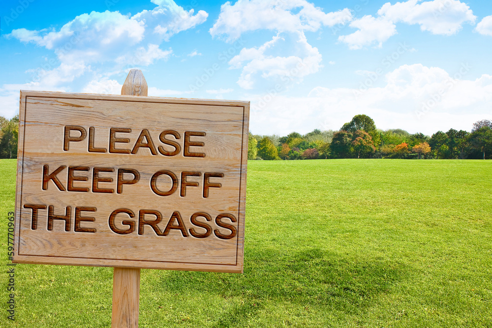 Please Keep Off The Grass - concept with wooden pole on a green meadow with sign indicating