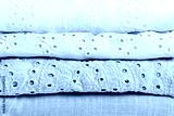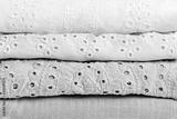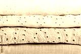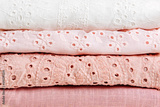 Stack of baby clothes. Cotton clothes and muslin swaddle blanket in pastel colors. Clean freshly laundered, neatly folded kids clothes. Close up