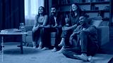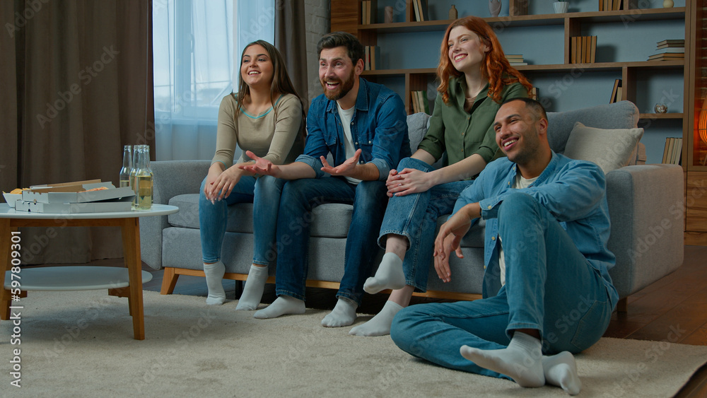 Four diverse ethnicity friends watch television at home cinema people spectators watching smart tv channel comedy show serial movie multiracial african american caucasian women men laughing enjoy film