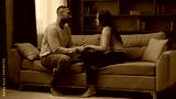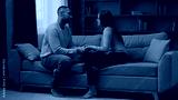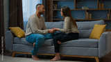 Multiracial couple in love married family man husband talk with woman wife hold hands supporting relationship care romantic intimacy date sit on sofa in living room girl guy talking tender relations