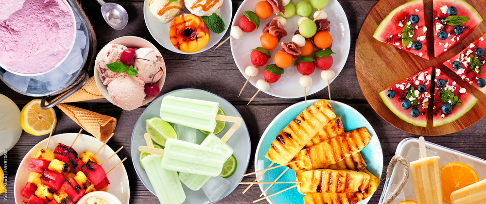 Refreshing summer food table scene. Variety of grilled fruits, ice cream and ice pops. Overhead view on a dark wood banner background.