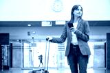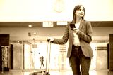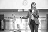 young girl waiting at a station with a pink suitcase in one hand and her smart phone in the other