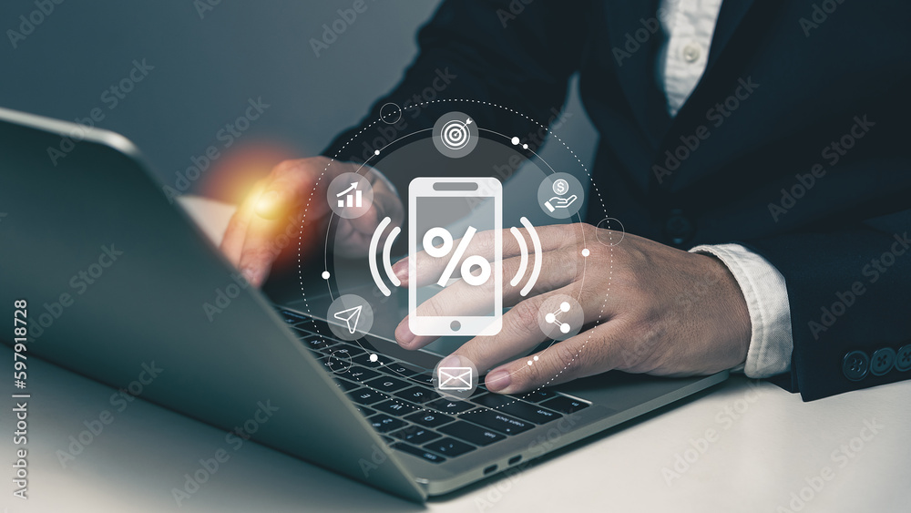 Percentage income concept, mobile application, network security, money planning management, target to success, interest rate, income and return, investment fund, dividend tax, retirement, revenue.