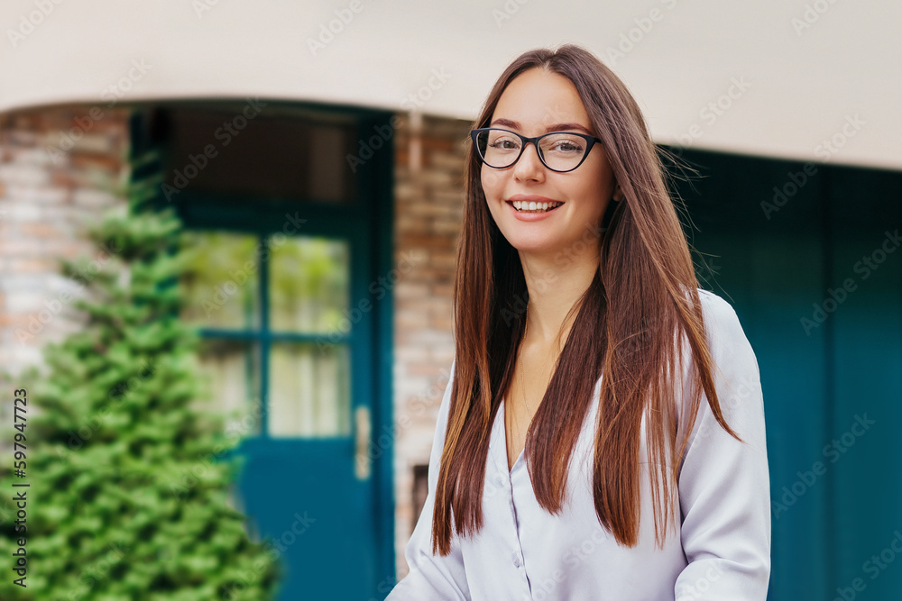 Student girl sits at a cafe table, uses a laptop and looks at the screen