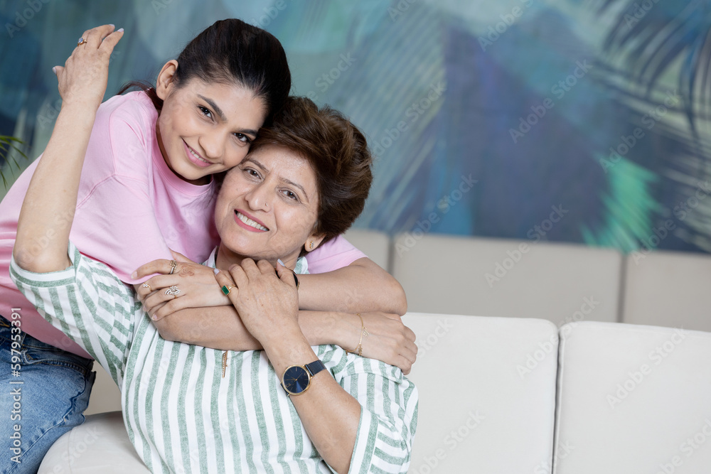 candid of Happy indian young girl with mother giving hug to mother and celebrating Happy mothers day
