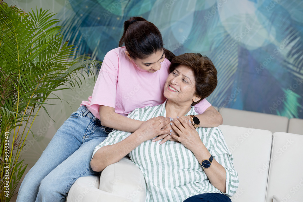 candid of Happy indian young girl with mother giving hug to mother and celebrating Happy mothers day