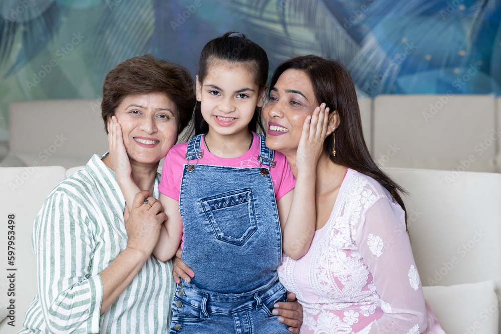 Indian multi generational family daughter and granddaughter cheerfully enjoying together