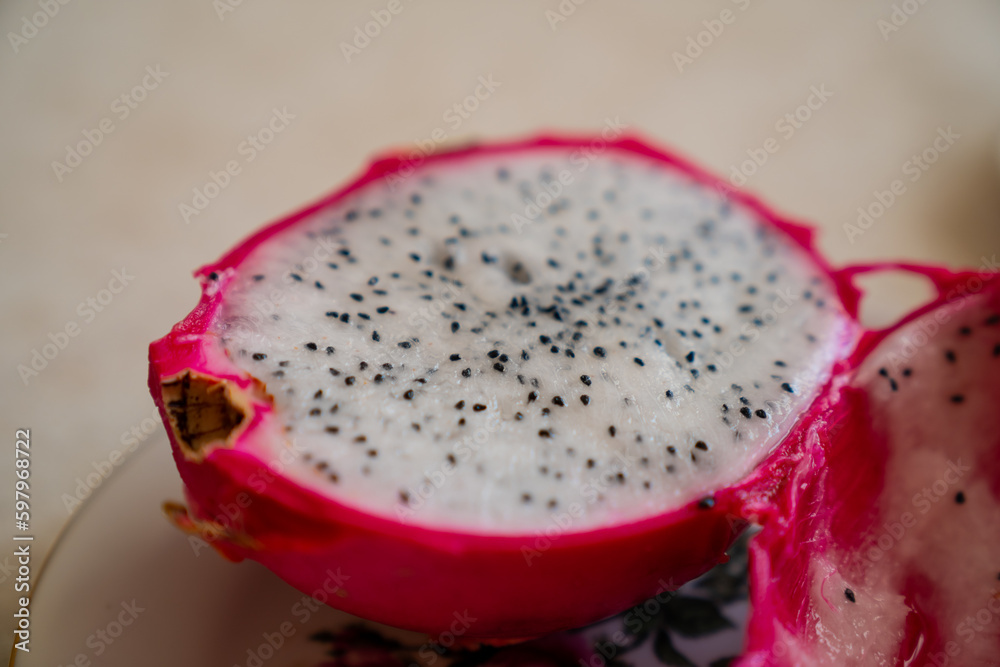 Pitaya (dragon fruit) cut in half with finer and black seeds showing