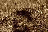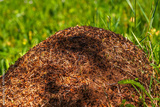 Closeup view on top of anthill from pine needles and branches with colony of ants in spring woodland. The observation of nature and creatures concept
