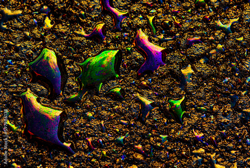 Oil stain on Asphalt road after rain, color Gasoline fuel spots on Asphalt Road