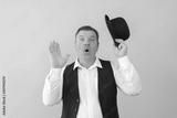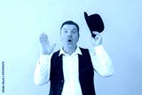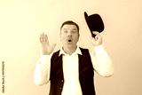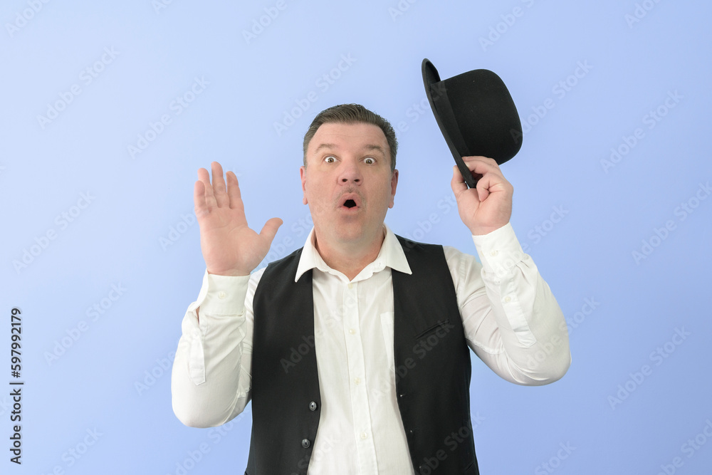 Surprised man in a retro suit. Bowler hat, white shirt and black vest. Light blue background.
