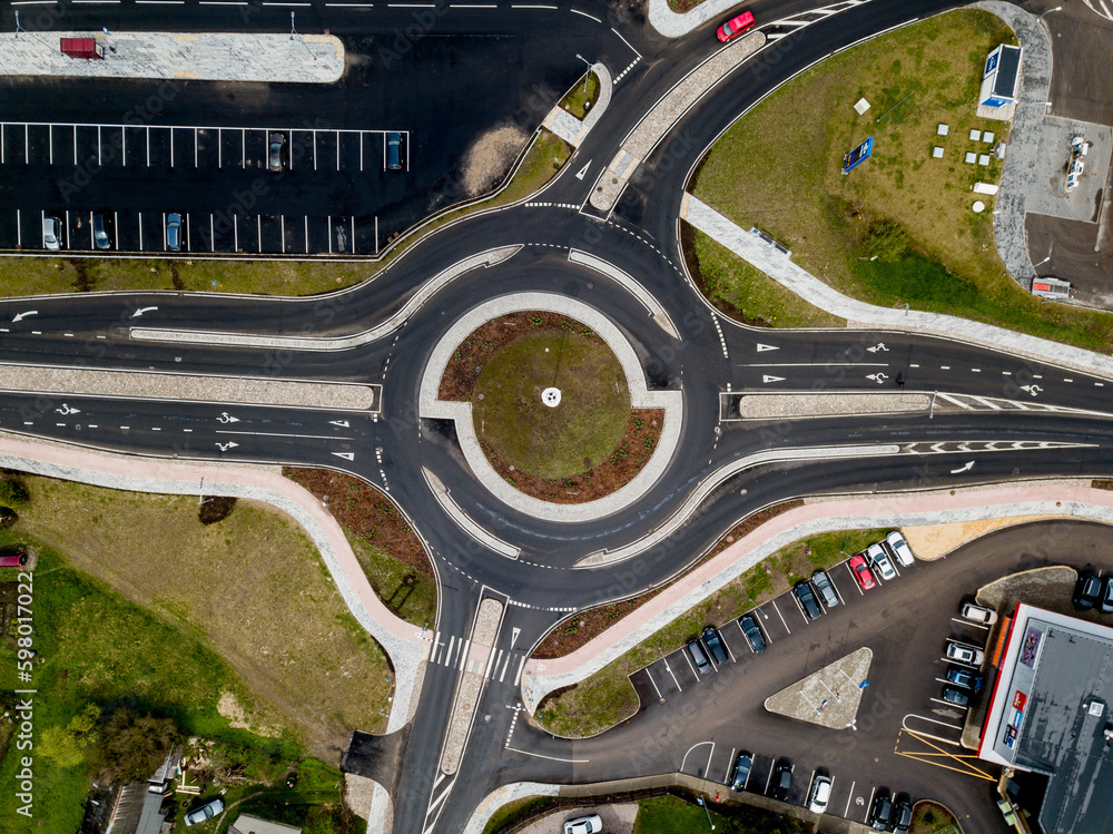Moder traffic circle (roundabout) traffic solution design aerial view
