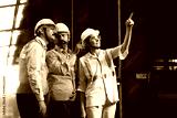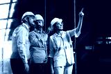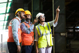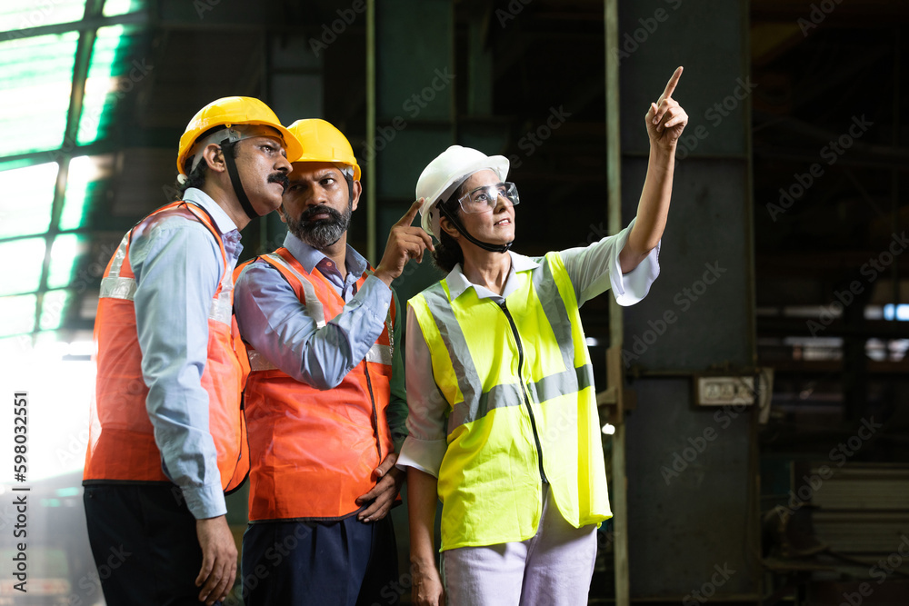 Team of happy confident indian engineers wearing safety hard hat and vest standing at industrial factory pointing at something.