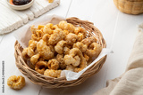Pork crackling,deep fried pork skin on wicker basket,yummy snacks food.