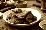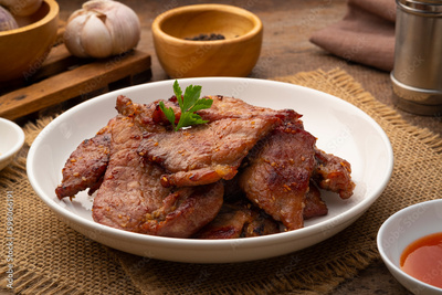 Fried sun dried pork in white plate.(Moo dad deaw).Asian food style,food preservation