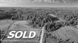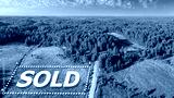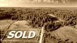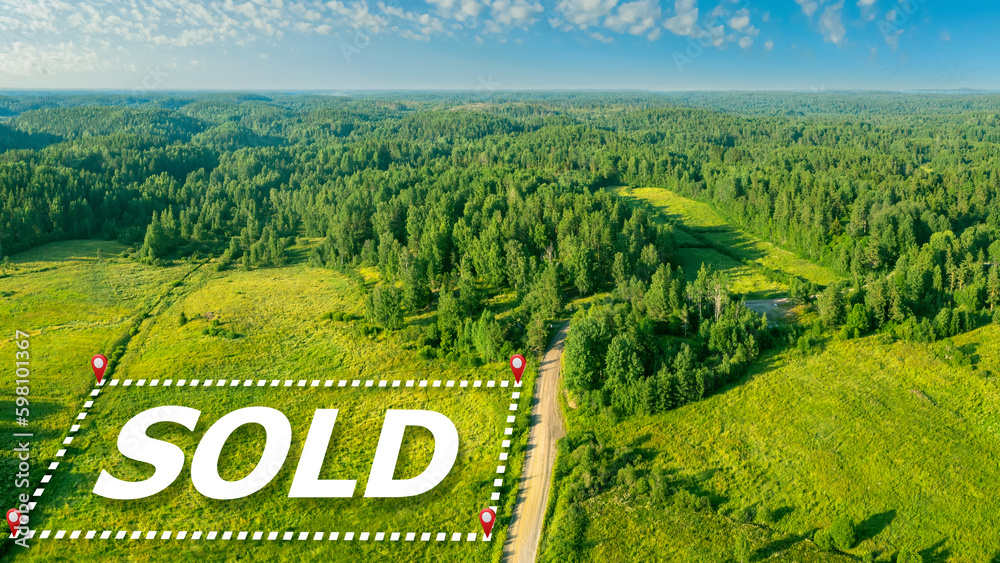 Sold logo on ground. Sale of land for construction. Picturesque nature view from quadrocopter. Land was sold for construction of cottage. Territory for country villa. Sold land. Territory deals