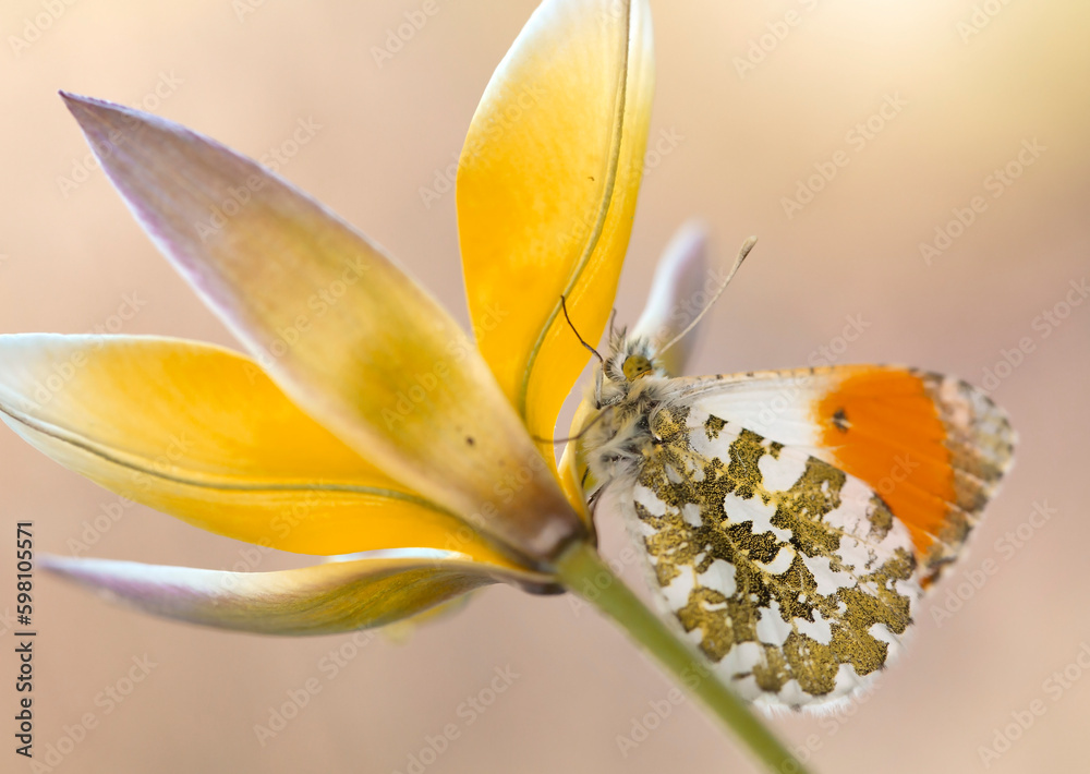 Wiosenny motyl Zorzynek Rzeżuchowiec na kwiatach Tulipana botanicznego