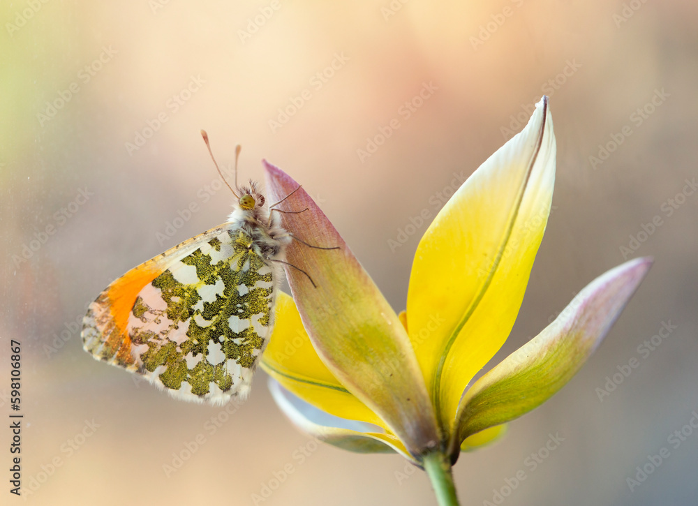 Motyl Zorzynek Rzeżuchowiec na kwiatach Tulipana botanicznego