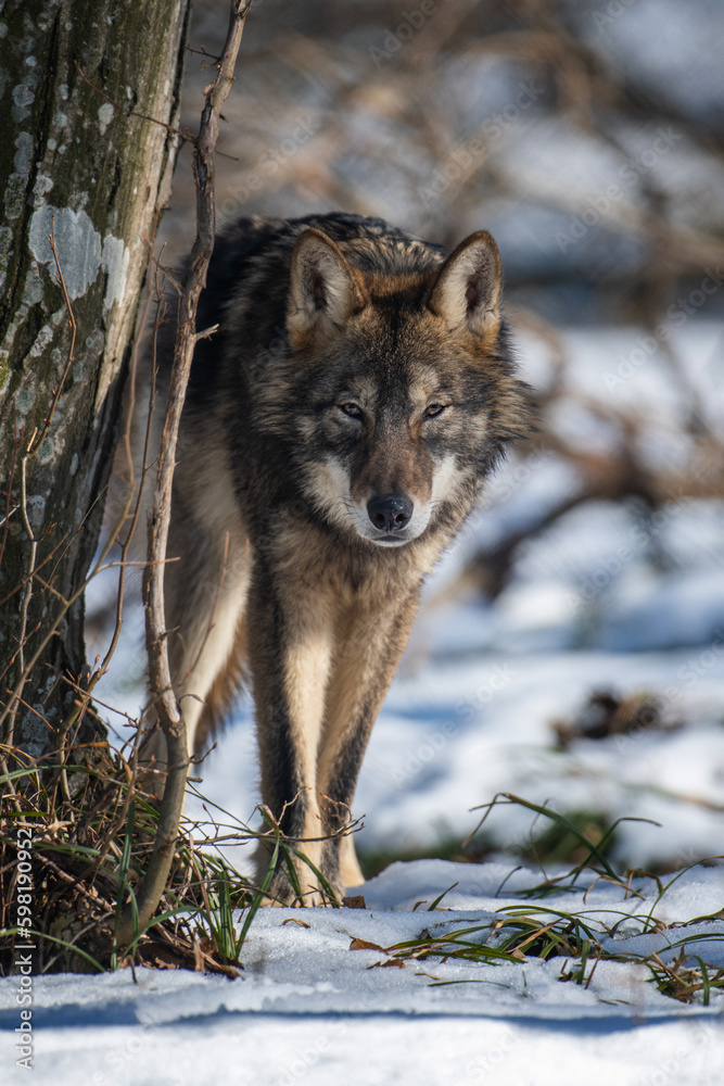 Wolf in the forest up close. Wild animal in the natural habitat