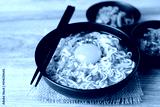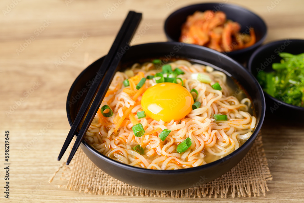 Asian instant noodle soup with fresh egg yolk eating with kimchi cabbage and seaweed salad