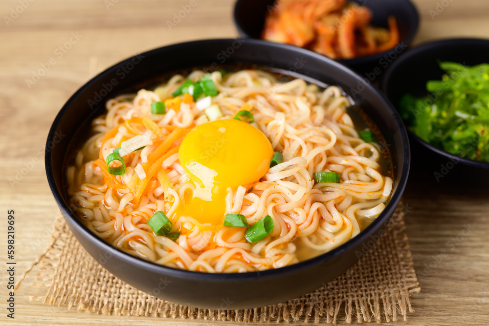 Asian instant noodle soup with fresh egg yolk eating with kimchi cabbage and seaweed salad
