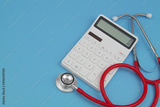 Close-up of red stethoscope and white calculator with copy space for text.