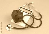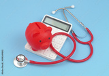 Stethoscope with red piggy bank and calculator on blue. Price of health insurance concept.