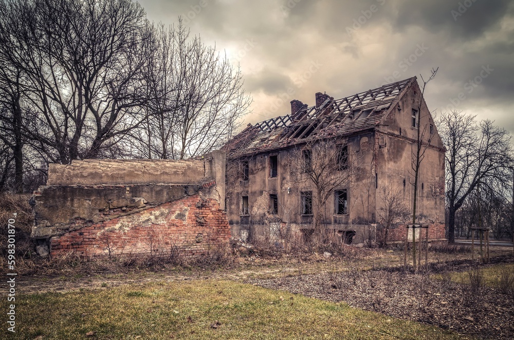 Old ruined building in dark scenery. Left collapsing house, the object falling into ruin is probably inhabited by homeless people.