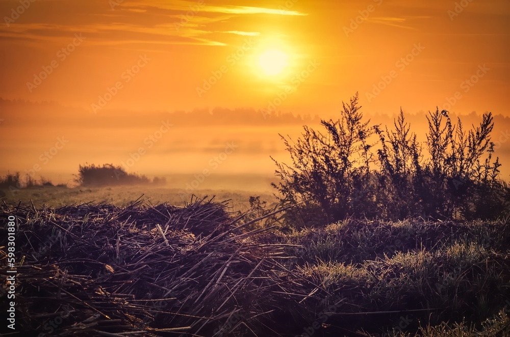 Countryside landscape in early morning. Straw and bushes on grassland during the sunrise, Poland.