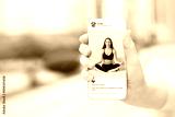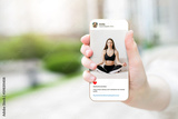 Woman looking at beautiful model's photo doing yoga on mobile phone
