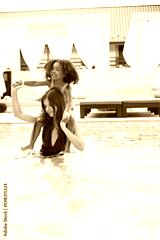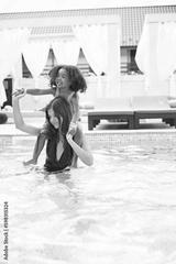 African american girl sitting on a shoulders of her caucasian mother in the pool
