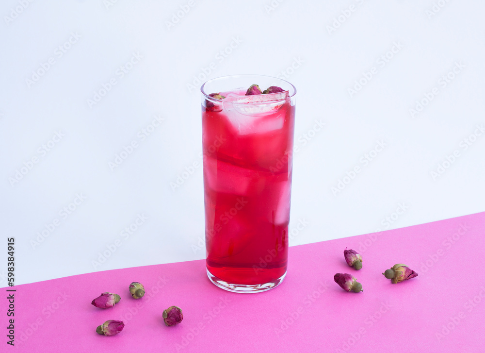 Pink cocktail with ice and rose flower in the drinking glass on the colored background. Close-up.