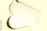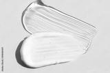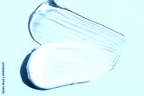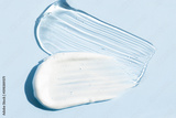 Smears of transparent gel and white cream on a blue background, macro. Cosmetics for care and moisturizing.