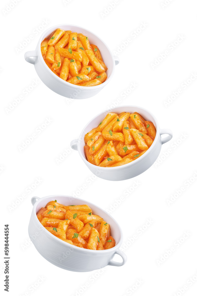 Tteokbokki. Traditional korean rice sticks in hot spicy sauce on a white isolated background