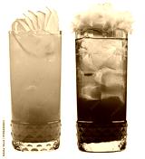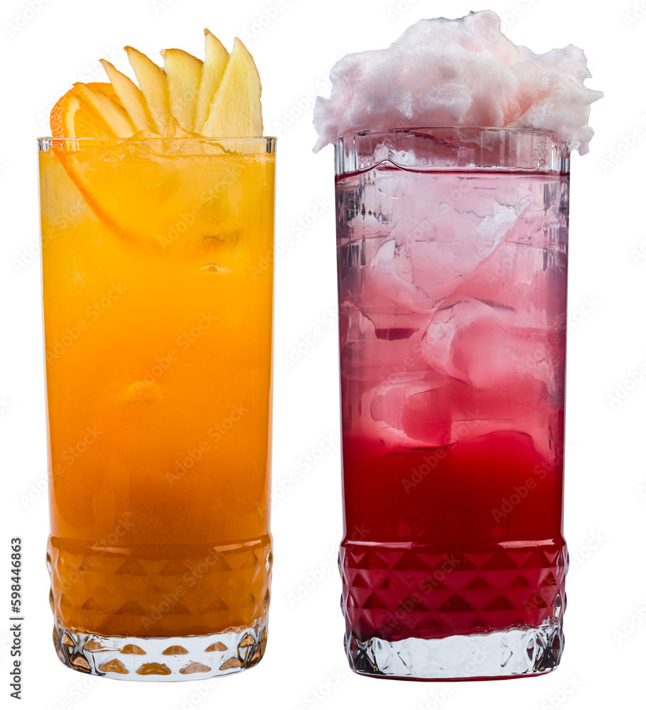 set with cocktails, yellow drink with orange and ginger and red lemonade with ice and cotton candy, isolated background, png for design