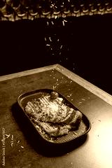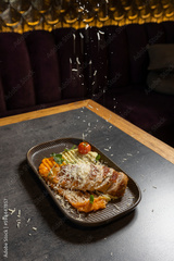 Roasted turkey served with potato and carrot puree, cheese grating