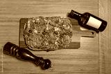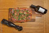 Arugula prosciutto pizza served on a wooden board