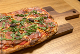 Arugula prosciutto pizza served on a wooden board