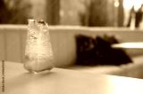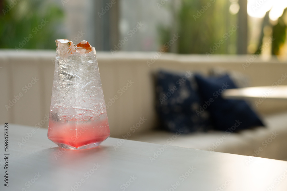 A glass with a pink liquid on it sits on a table in front of a couch.