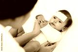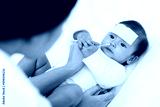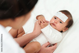 mother using cotton bud to clean nose of sick baby with cool fever jel pad on bed