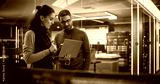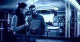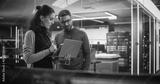Portrait of Two Female and Male Engineers Using Laptop Computer to Analyze and Discuss How to Proceed with the Artificial Intelligence Software. Casually Chatting in High Tech Research Office