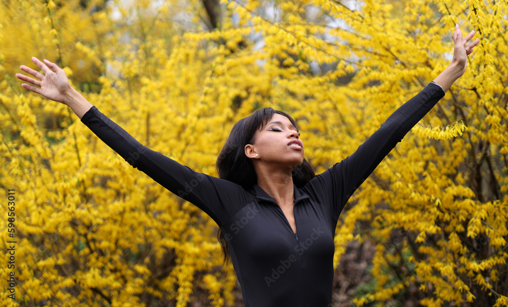 A relaxed woman in unity with nature raised her hands up against the background of yellow flowers.