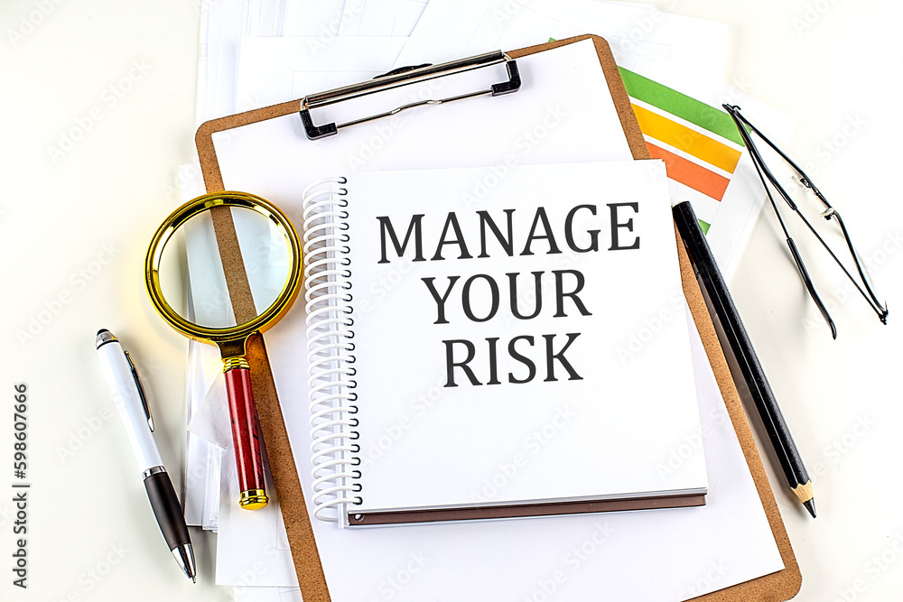 MANAGE YOUR RISK text on notebook with clipboard on white background