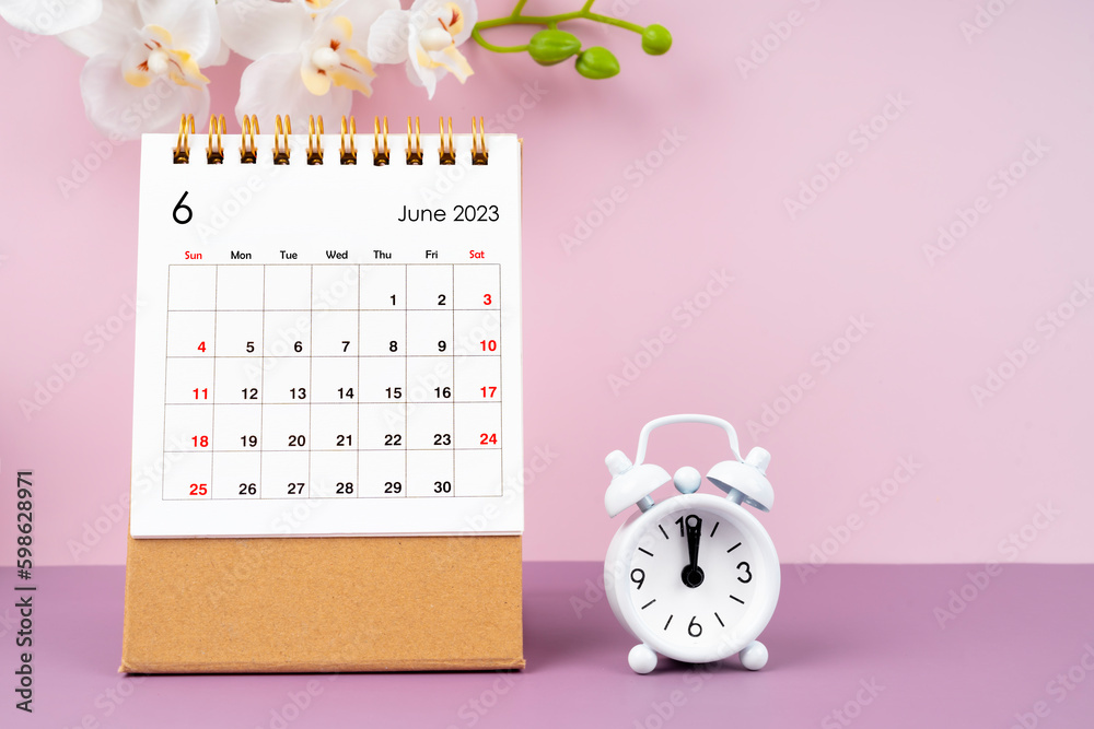The June 2023 calendar desk and alarm color with white orchid on pink background.